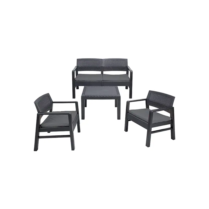 Set Kilimanjaro, in polipropilene effetto rattan color antracite, composto da divanetto, due sedie, tavolino + 4 cuscini